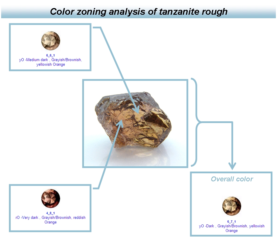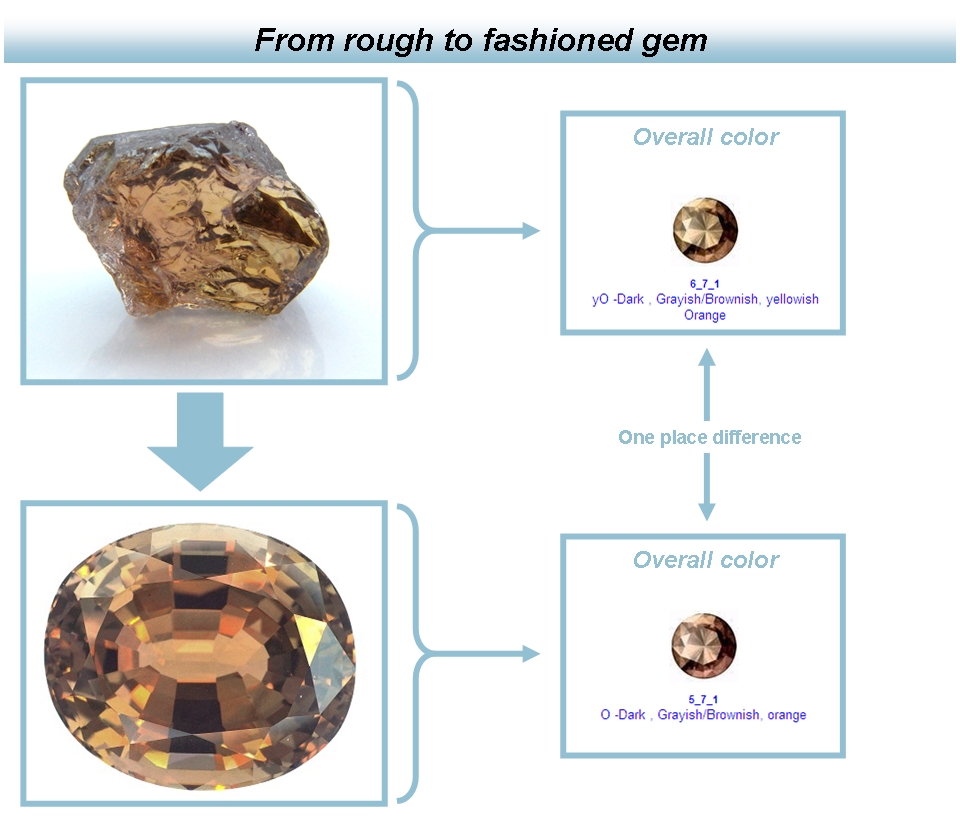The color of yellow to orange zircons range from orangey-Red (4) to orangey Yellow (7). Most of them possess a very dark tone, almost black, and are heated to lighten them for a more pleasant appearance.