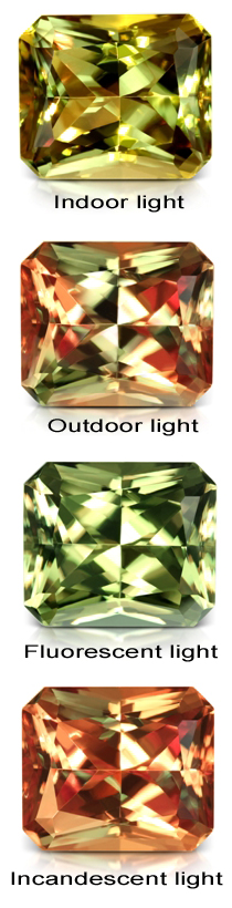Alexandrite exhibits a special effect. It changes color upon moving from a daylight environment to artificial incandescent light. This effect, also called the Alexandrite effect, is a result of the selective absorption and transmission characteristics of the stone, the light source and the eyes’ sensitivity to colors. The Alexandrite spectrum is intermediate between those of Ruby and Emerald and close to the threshold of red to green color change.
