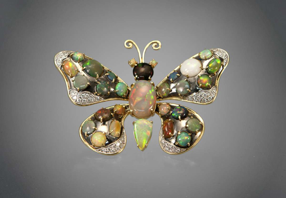 The Opal Butterfly brooch displays opals from Virgin Valley, Nevada