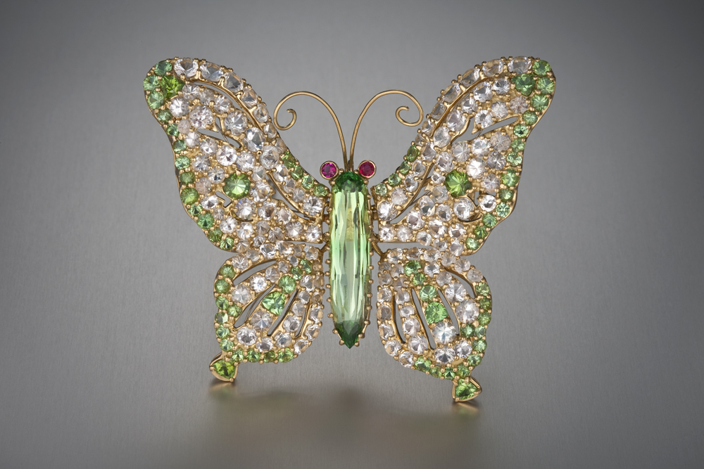 A 10.01-ct. gemstone, described as the largest hiddenite ever faceted, forms the central feature of the Hiddenite Butterfly.