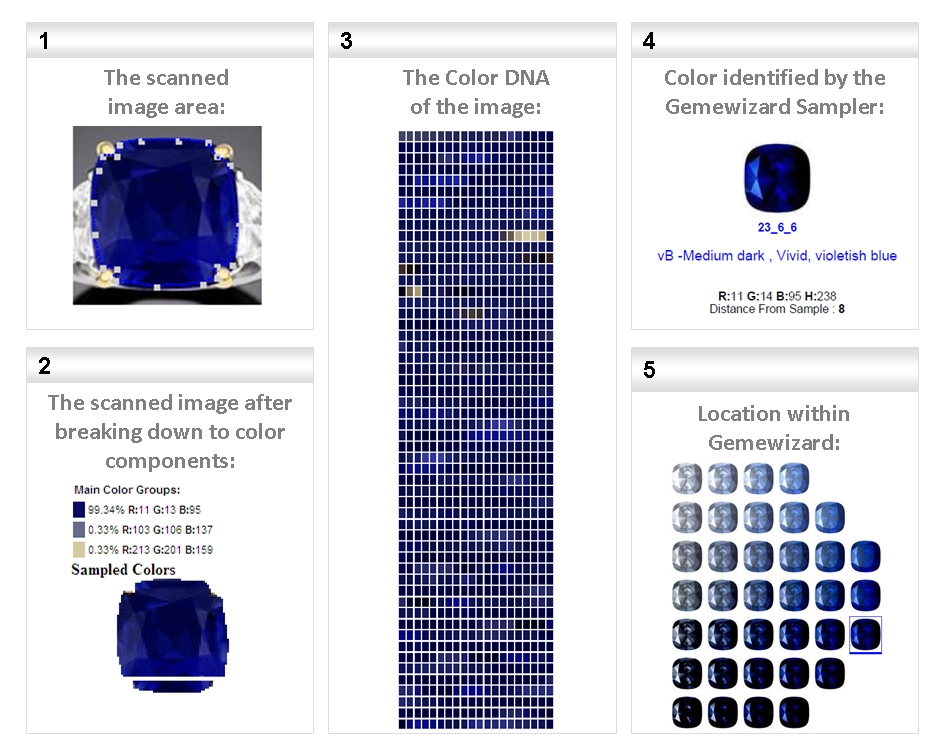 We took the ring image and marked the gemstone borders. Then, we analyzed the area using the Sampler feature of GemePro™. The Sampler gave us the color components of the image together with its Color DNA. Using a sophisticated algorithm, the Sampler identifies the sapphire color code as GW 23_6_6, also known as 'medium dark vivid violetish blue' by GIA® definition.
