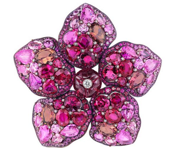 Among the pieces in the collection is the Mulan brooch, named after the lead character in the 1998 animated feature film which is based on the Chinese legend of Hua Mulan. The brooch takes the form of a flower, meant to incorporate the fighting spirit of Mulan, and features a rubellite cabochon at its center, offset by rubies cut in ovals and squares, as well as violet and pink spinels, pink oval tourmalines, pink pear-shaped and round sapphires and round rubellites.