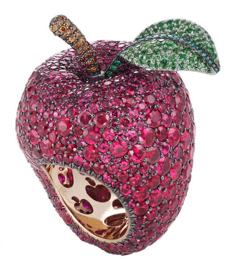 The Snow White Ring, named after Disney's most famous princess, from the animated feature film first released in 1937, is, as one would expect, an apple-shaped ring, and is made of white and rose gold. Its stem is encrusted with round brown diamonds and its leaf is set with tsavorites. The apple itself is set with round-cut rubies.