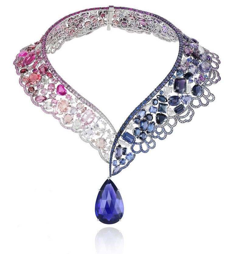 The Belle necklace, set with tanzanite, blue and pink sapphires, amethysts, diamonds, rubellites, spinels, kunzites and morganites.
